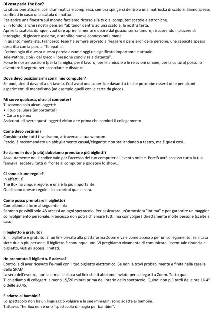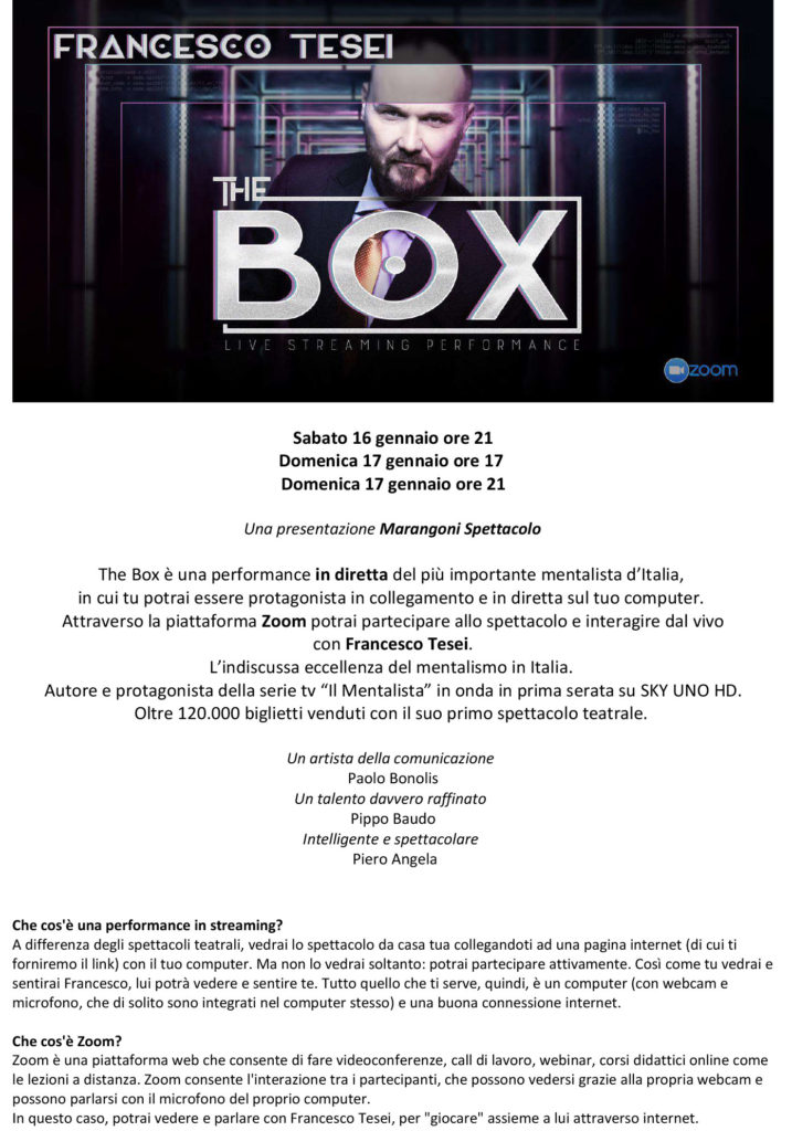 “The Box”, gratis sulla piattaforma Zoom il 16 e 17 gennaio 2021. Il mentalista Francesco Tesei in diretta streaming per Carpi. Prenotabili da oggi i “posti” per i tre spettacoli.