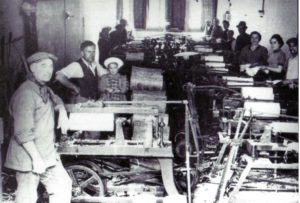 Fu lì che vidi per la prima volta un televisore e, come mi era capitato di fare con la radio, d’impulso mi venne di andare a vedere dietro l’enorme cassone sospeso in alto su una grande mensola, pensando di individuare una truppa lillipuziana di giocolieri. Davanti a quella che appariva una magia, rimanevo a bocca aperta per un tempo indeterminato, senza quasi deglutire fino allo sbavezzo, che mi scuoteva e, dopo essermi guardata intorno per sincerarmi che nessuno mi avesse colto in quell’attimo terribile. Un momento che mi faceva vergognare e per il quale ero rimbrotta dalla mamma, che mi apostrofava con l’appellativo di acchiappamosche. Poi uscivo e mi soffermavo in quella sequenza di botteghe con laboratorio: Goldoni, Camurri e quindi il calzolaio Canulli, un signor calzolaio che non solo riparava calzature ma, su ordinazione, le faceva proprio completamente; nel suo laboratorio aveva più vetrine dove erano esposti i prodotti per la cura delle scarpe e del pellame in generale e ce n’era una particolarissima, dove permanentemente era allestito un presepe. La bottega che però mi catturava era quella del pagliaro Zucchi, attigua a Prandi.