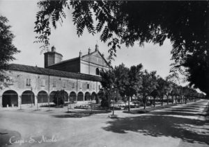 Il portico iniziava a popolarsi in quell’ora in cui i raggi del sole, a quel tempo privi di ostacolo, si infilavano obliqui nelle arcate del colonnato, ravvivando il rosso dei mattoni fino a dare la sensazione di una loro luce interna. Era questione di una manciata di magici minuti, l’ombra di allungava fino a piegarsi sul muro della chiesa e poi, d’un tratto spariva.